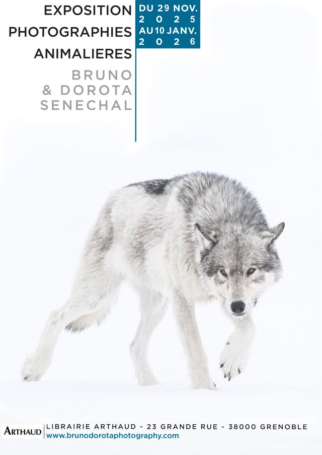 From November 29th, 2025, to January 10th of 2026 : 5th Edition of exhibits by Dorota & Bruno SENECHAL, wildlife photographers, at GALERY RABOT - 3d floor of book store ARTHAUD, 26 Grande Rue in GRENOBLE (France).